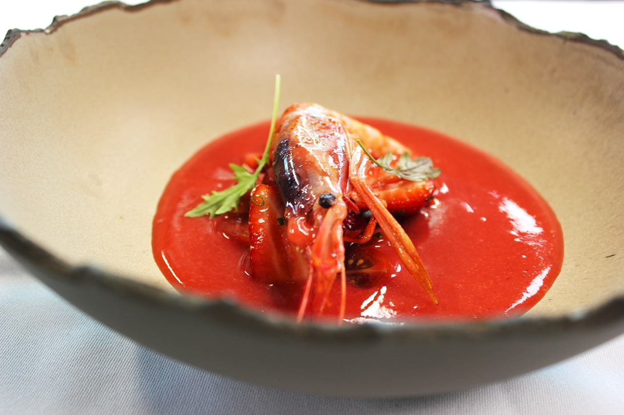 Para empratar: colocar a salada num prato de sopa, o camarão por cima e, finalmente, o gaspacho a cobrir a salada.