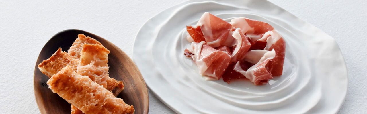 Cortar o pão em 3 ou 4 pedaços e servir em conjunto com o presunto previamente laminado.