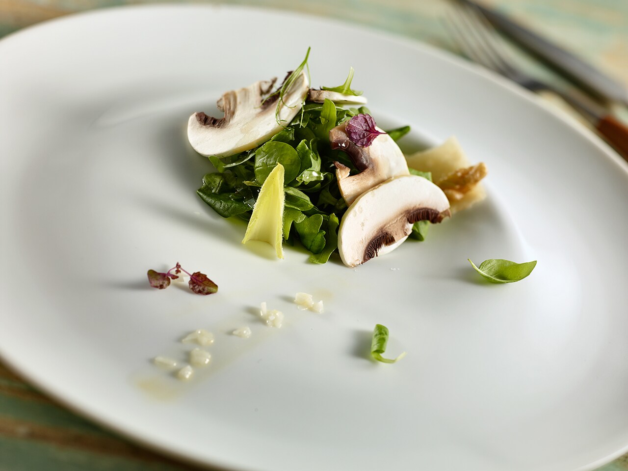 1. Misture numa saladeira os cogumelos, o agrião e o molho vinagrete.