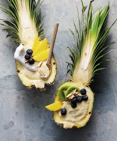 2. In a blender, pulse banana, mango and pineapple until smooth but still thick, stopping and stirring occasionally.