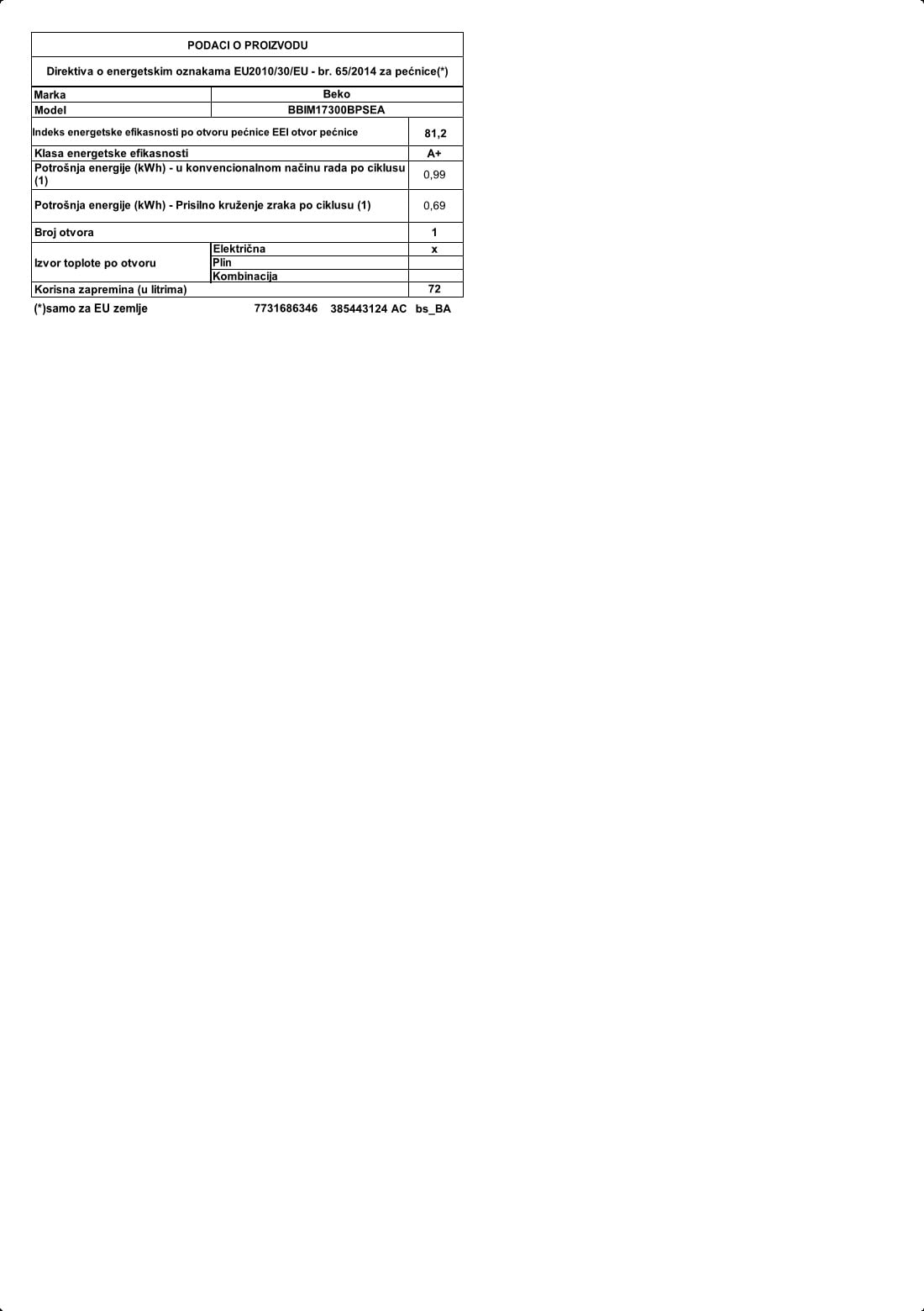 BBIM17300BPSEA: Ugradbena rerna (60 cm 72 L)