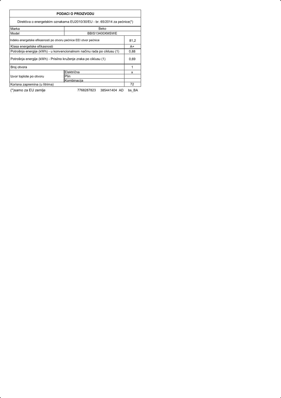 BBIS13400XMSWE: Ugradbena rerna (60 cm 72 L)