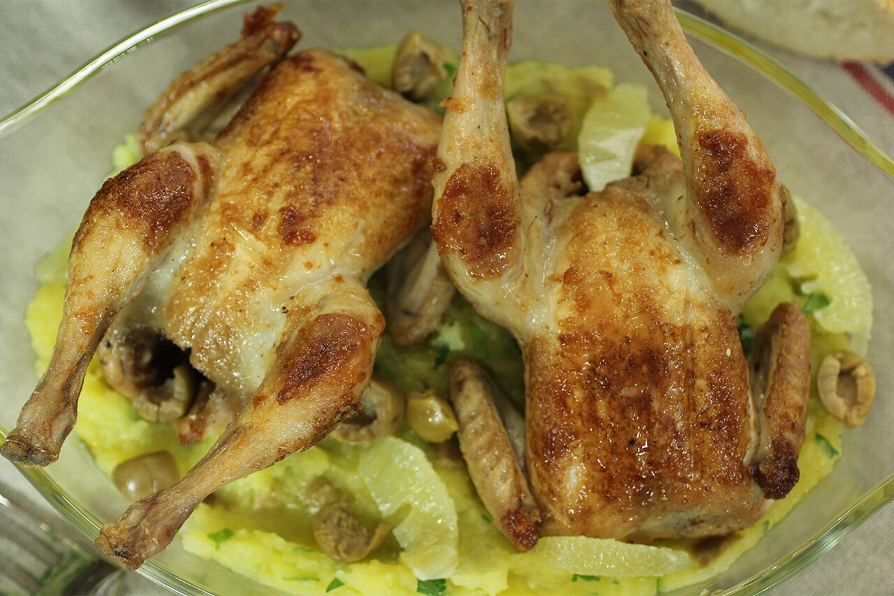 3. Colocar una cazuela al fuego, agregar el aceite de oliva y dorar los picantones por la parte de una pata (de lado) durante 5 minutos, darle la vuelta y dorarlos otros 5 minutos más por la otra pata.