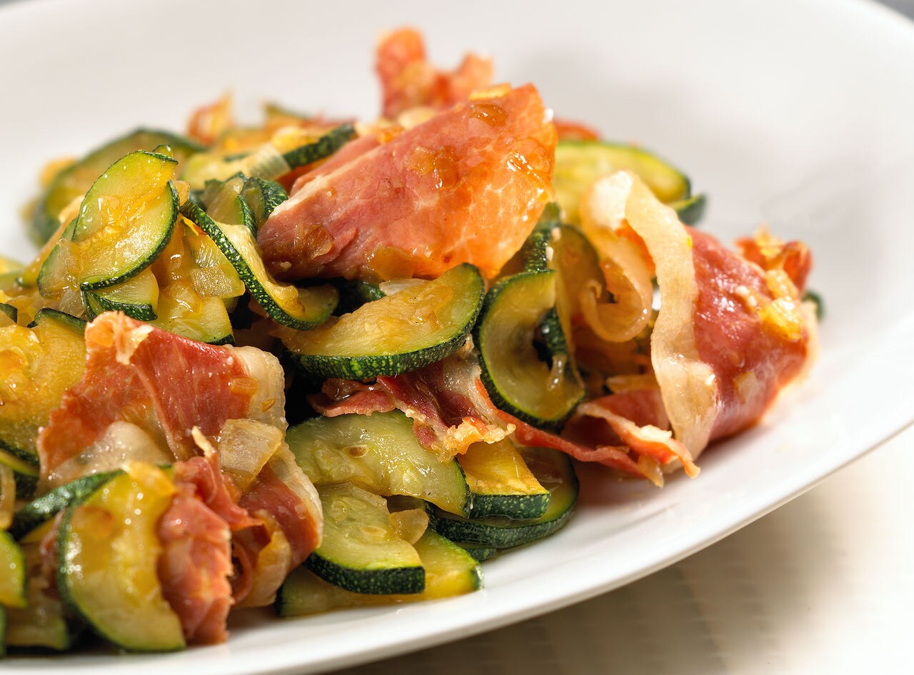 Meneamos frecuentemente el contenido. Pasados aprox. 8 minutos, añadimos a los calabacines la cebolleta, el ajo y los dados de jamón salteados con antelación y damos unas vueltas para que se mezclen bien con la verdura.