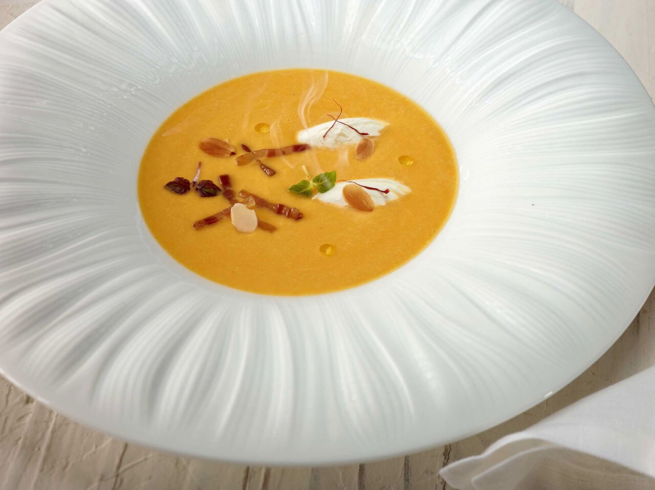 1. Servir la crema de calabaza y espolvorear con las almendras tostadas y la tocineta crujiente.