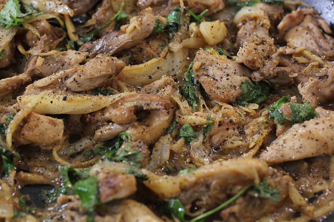 7. Añadir el pollo al sofrito junto con la salsa de soja, el limón y el zumo de limón.