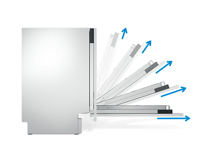 Nooit meer puzzelen hoe je grote schalen of hoge wijnglazen in de vaatwasmachine krijgt. Met het 3 Position Acrobat System kun je het bovenste rek op drie verschillende standen zetten om meer ruimte te maken voor grote schalen op het onderste rek.