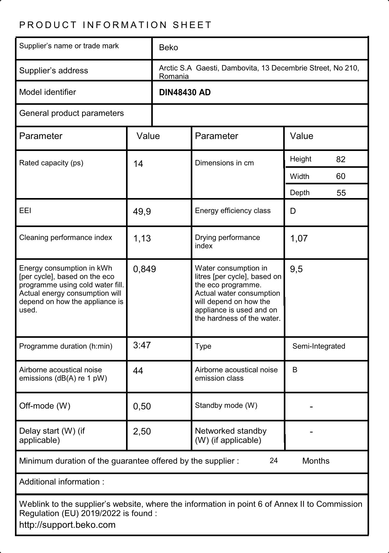 DIN48430 AD: 14 Plaats instellingen Volledig geïntegreerd volledige grootte Afwasmachine