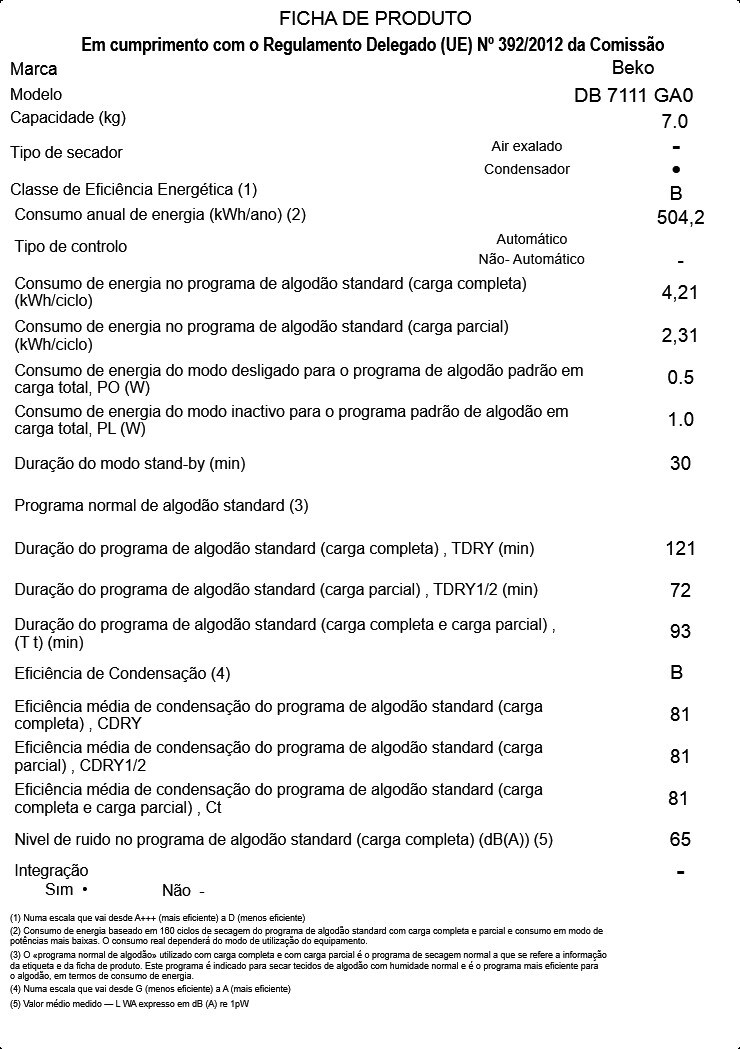 DB 7111 GA0: Máquina de Secar Roupa Condensação 7Kg