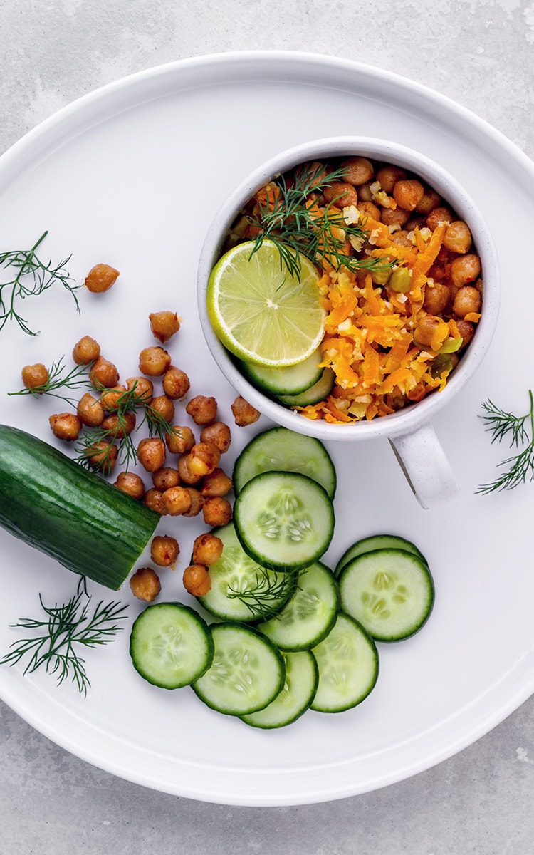 6. Blumenkohl-Mischung in zwei Servierschüsseln geben, die Kichererbsen an der Seite verteilen und mit Gurken-und Zitronenscheiben servieren.