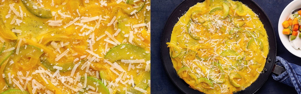 2. Butter in einer Pfanne erhitzen, gelbe Paprika und Zucchini hinzufügen und 3 Minuten anbraten. Die Eiermischung dazugeben, die Pfanne abdecken und das Ganze 3 Minuten lang kochen lassen.