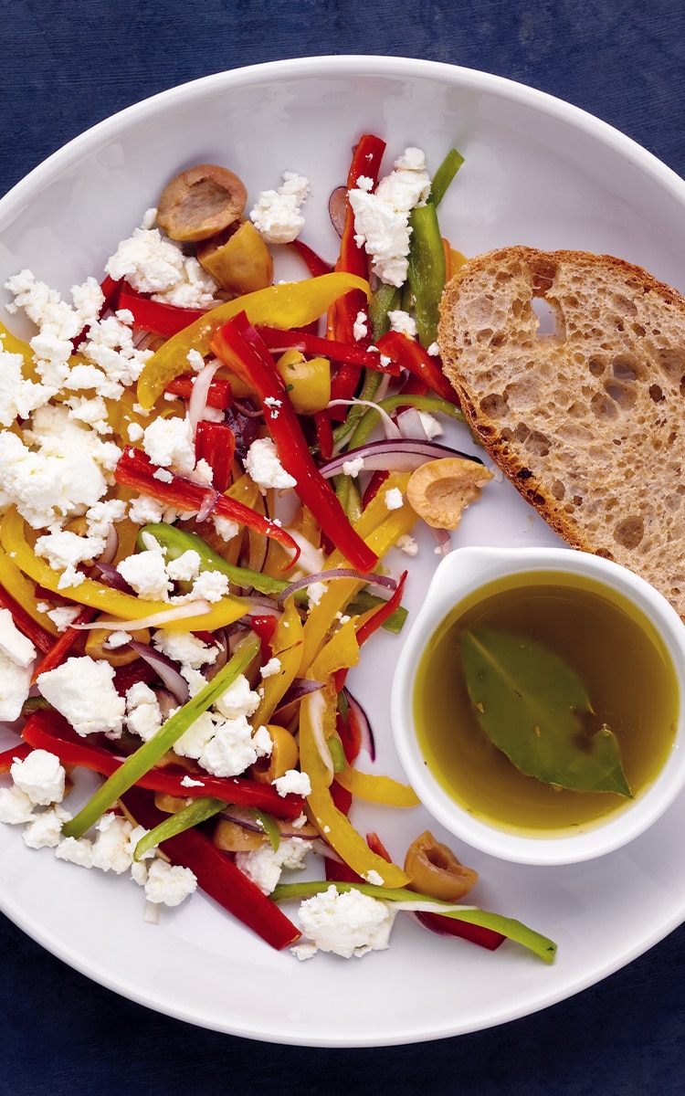 2. Paprika, Zwiebeln und Oliven in einer großen Schüssel vermengen. Das Dressing hinzufügen und unterrühren. Abdecken und bei Raumtemperatur 1 Stunde durchziehen lassen. Anschließend überschüssiges Dressing abtropfen lassen. Dann den Fetakäse zur Paprikamischung geben und durchmischen. Mit Salz und Pfeffer würzen.