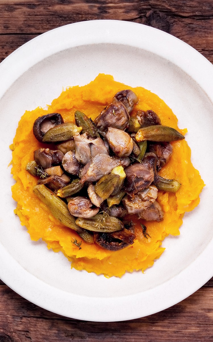 5. In einer großen Schüssel Hühnermagen, Pilze und Okra mit Olivenöl, Knoblauch und Gewürzen vermengen.