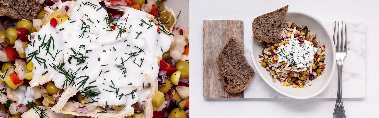 ويُعد طبق سلطة الدجاج هذا خيارًا غنيًا بالقيمة الغذائية، حيث يتكون من الدجاج الذي يحتوي على البروتين والسلطة المليئة بالخضروات ذات القيمة الغذائية. ويُستكمل هذا الطبق بالتتبيلة الخفيفة والمنعشة، ويمكن الاستمتاع بتناوله بمفرده أو مع طبق من الخضروات الورقية.