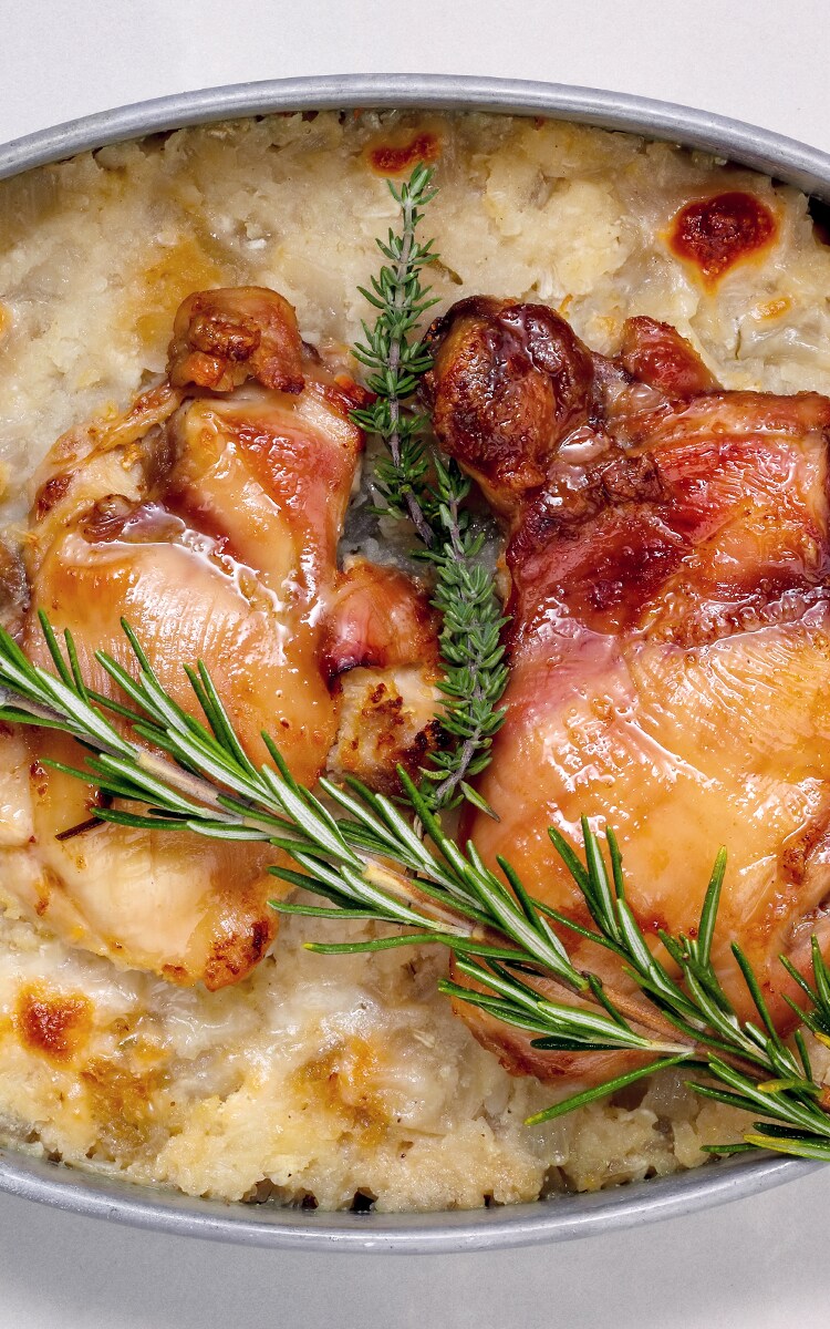 5.    ضع الوركين في صينية الطهو. قم بتغطية الجزء العلوي بورق الطهو وفوقه ورق الألومنيوم.
