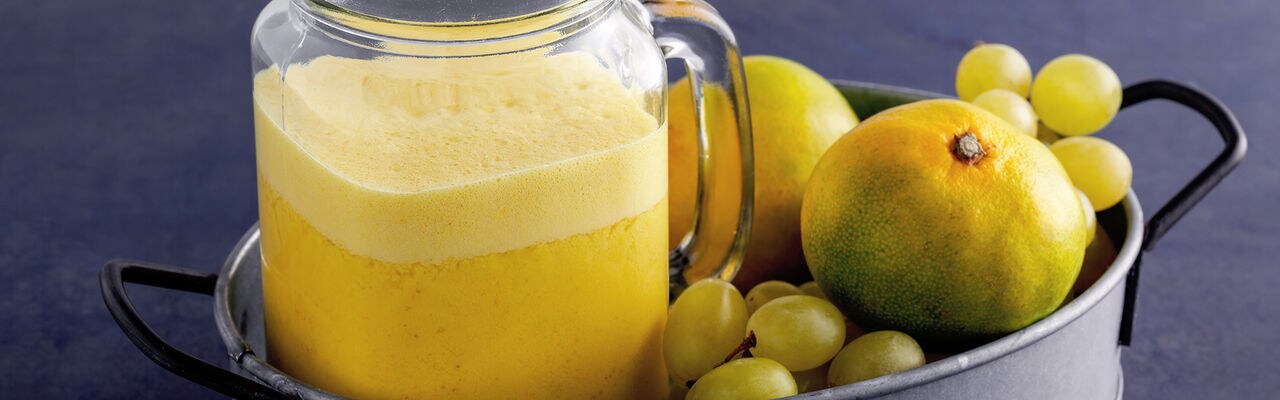 يُعد هذا المخفوق مثاليًا لتعزيز الطاقة بسرعة. يضفي اليوسفي حلاوة لذيذة، بينما يضفي العنب الأخضر مذاقًا حمضيًا منعشًا. يضفي الكركم لمسة من التوابل كما أنه مضاد رائع للالتهابات أيضًا. وباستخدام الأداة المناسبة، سيكون تحضير هذا المخفوق سهلاً جدًا. يمكنك استخدام مجموعة الخلاط اليدوي من Beko بقوة محرك 400 واط ونظام شفرتين من الفولاذ المقاوم للصدأ لتسهيل إعداد المخفوق.