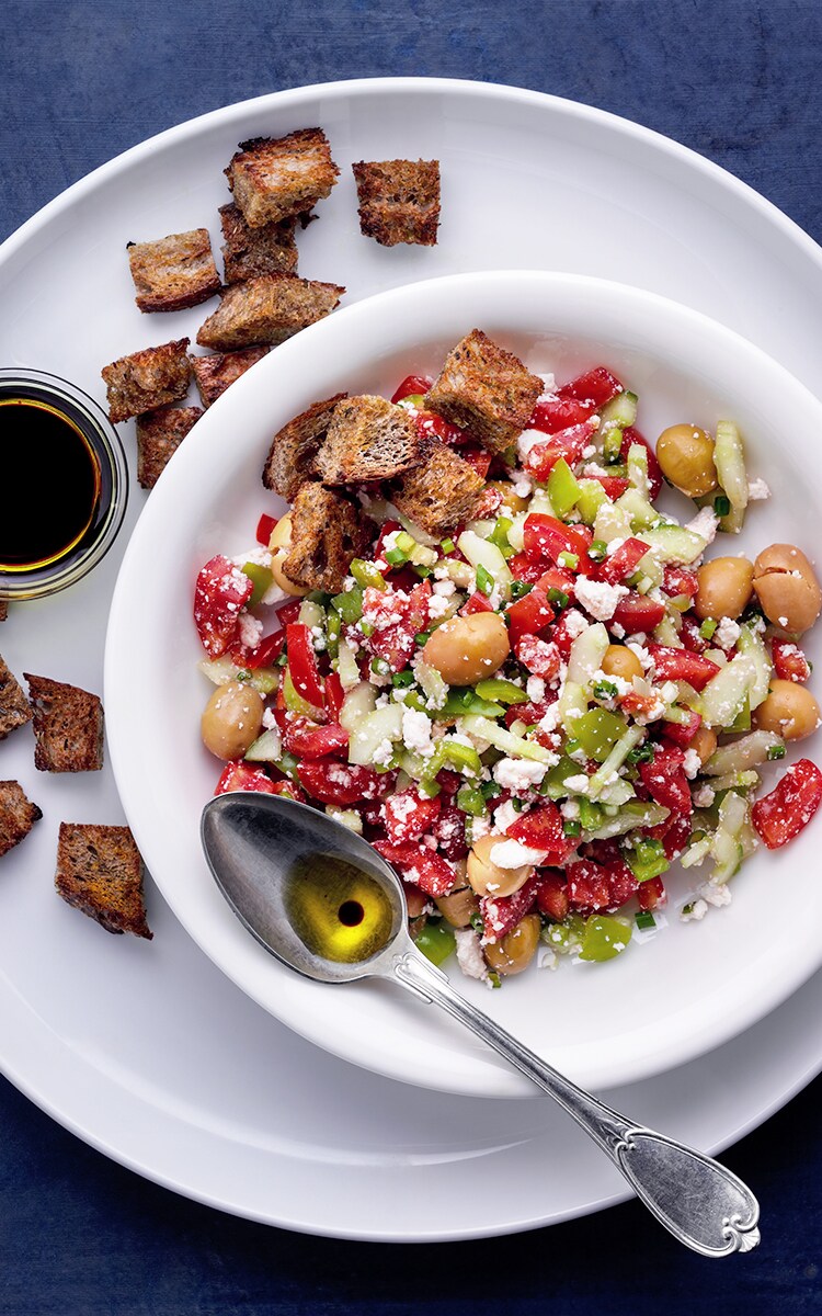 6. تُقسّم السلطة إلى طبقين، ثم توضع جبنة الفيتا فوقهما، ثم تُرش التتبيلة عليهما.