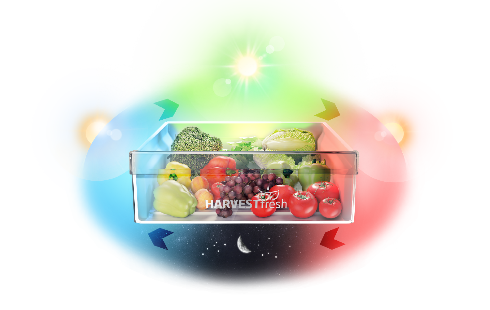 تُعد الفواكه والخضروات أفضل مصدر للفيتامينات. إلا أن الأطعمة في الظلام يمكن أن تفقد قيمتها الغذائية والفيتامينات نظرًا لأنها حساسة للضوء. هذا ما جعل بيكو تعمل على تطوير تقنية ™HarvestFresh ، وهي تسعى دائمًا إلى المساعدة على تناول الطعام الصحي. تحاكي تقنية ™HarvestFresh المبتكرة ثلاثية الألوان الضوء الطبيعي لأشعة الشمس خلال اليوم منذ شروقها، وصولًا إلى وقت الظهيرة، ثم غروبها قبل دخول الليل. وهذا يحافظ على جودة الفيتامينات في الفاكهة والخضروات في درج الثلاجة لفترة أطول.