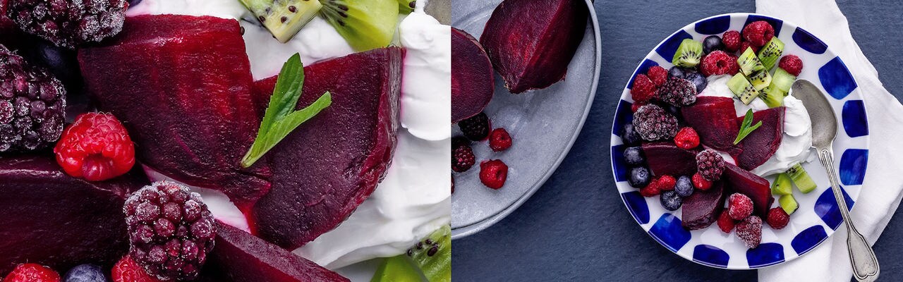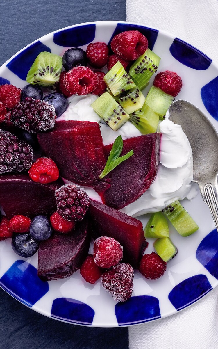 4. Serve the sliced beets with labneh, berries, mandarin, kiwi, and red basil. Enjoy!