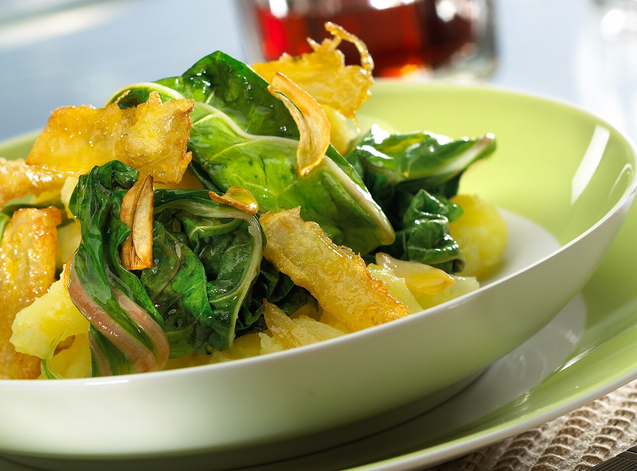 5. Colocamos la patata y el verde de acelga en una fuente honda o en platos hondos y cubrimos con las pencas de acelga rebozadas.
