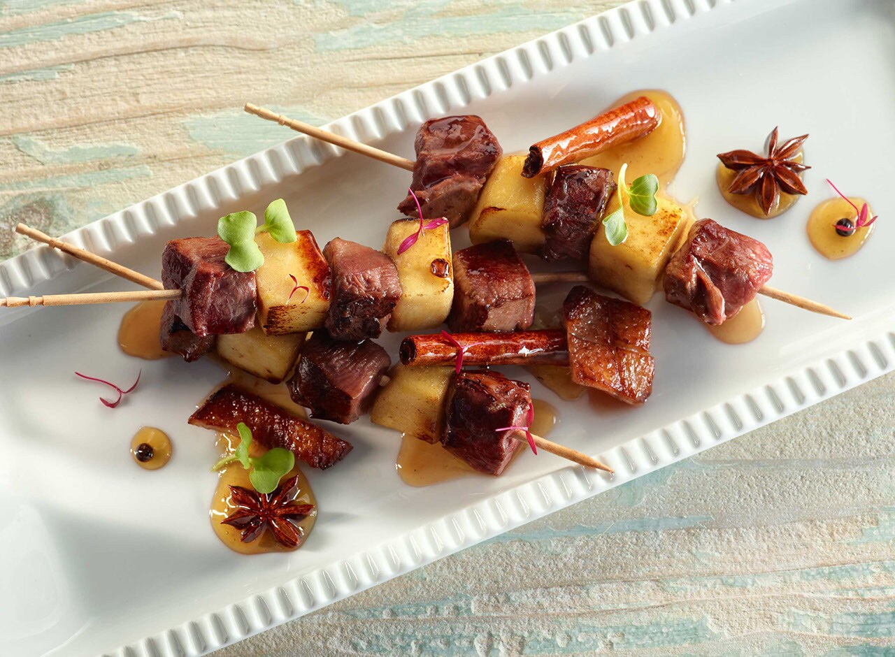 4. Por otro lado, en un palillo de brocheta de unos 20 cm de largo, colocar un cubo de pato, otro de manzana, así sucesivamente alternando hasta que la brocheta esté completa.