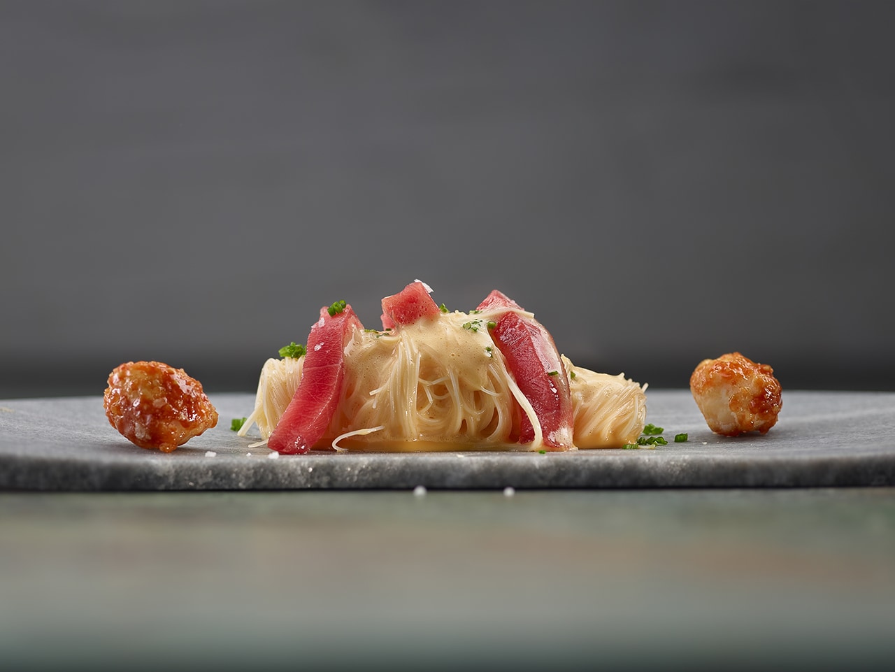 Con la ayuda de unas pinzas largas o un tenedor, hacer unas madejas con los fideos calientes aliñados y colocarlos en el centro de unos platos. Por encima, apoyar delicadamente los lomos de atún rojo loncheados y las macadamias garrapiñadas enteras o rotas. Listo.