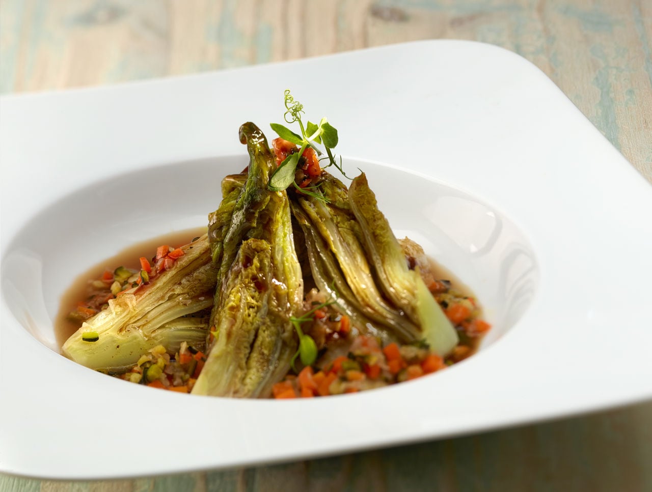 Colocar los cogollos de lechuga sobre las verduras y cocer en el horno a 170ºC durante 40 minutos, rociando los cogollos con el jugo continuamente para que se vayan glaseando.