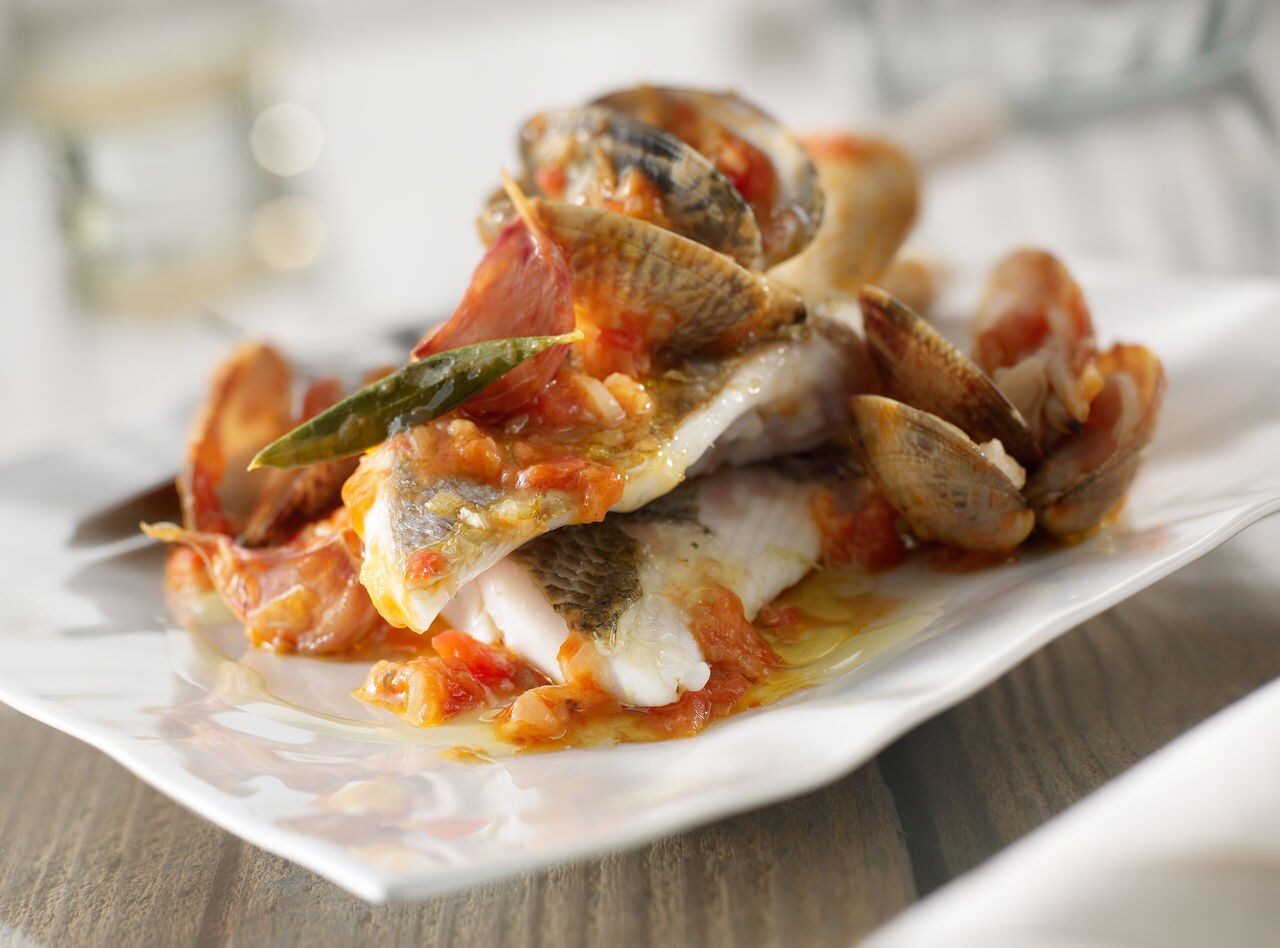 Con ayuda de una espátula retiramos los lomos de dorada del fuego. Avivar el fuego y dejar que el sofrito de tomate se consuma y caramelice, añadiendo el vino blanco. Dejar evaporar levemente e introducir las almejas, dando unas vueltas. En el momento que veamos que empiezan a abrirse, bajamos de nuevo el fuego, hacemos un hueco entre ellas para deslizar de nuevo los lomos de dorada medio cocinados, esta vez con la piel hacia arriba. Damos unas vueltas y dejamos que terminen de abrirse y el pescado se haga y quede con un punto rosado en su interior. Será cuestión de minutos.