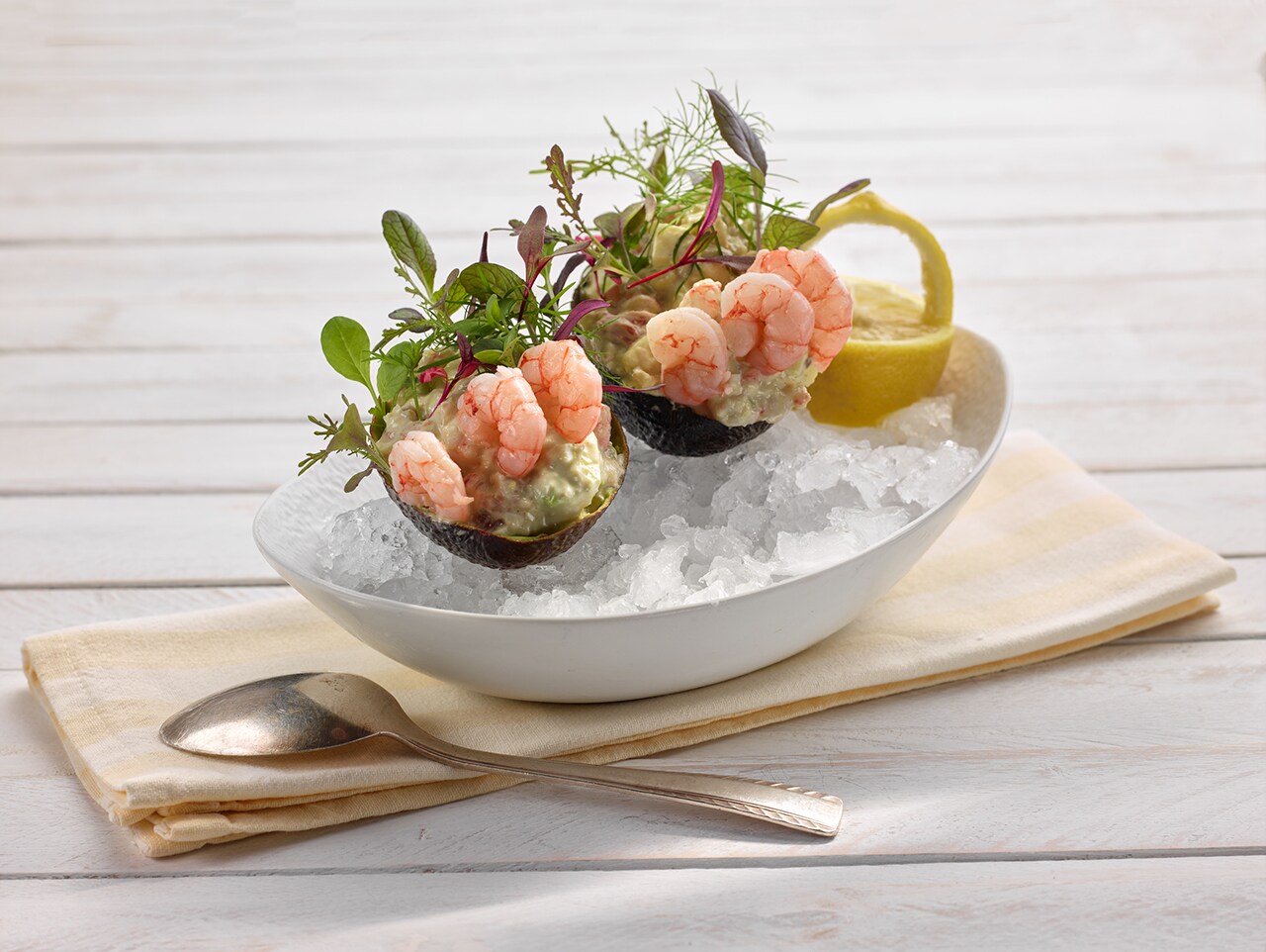 7.  Rellenar las cáscaras de aguacate con la ensalada bien fría.