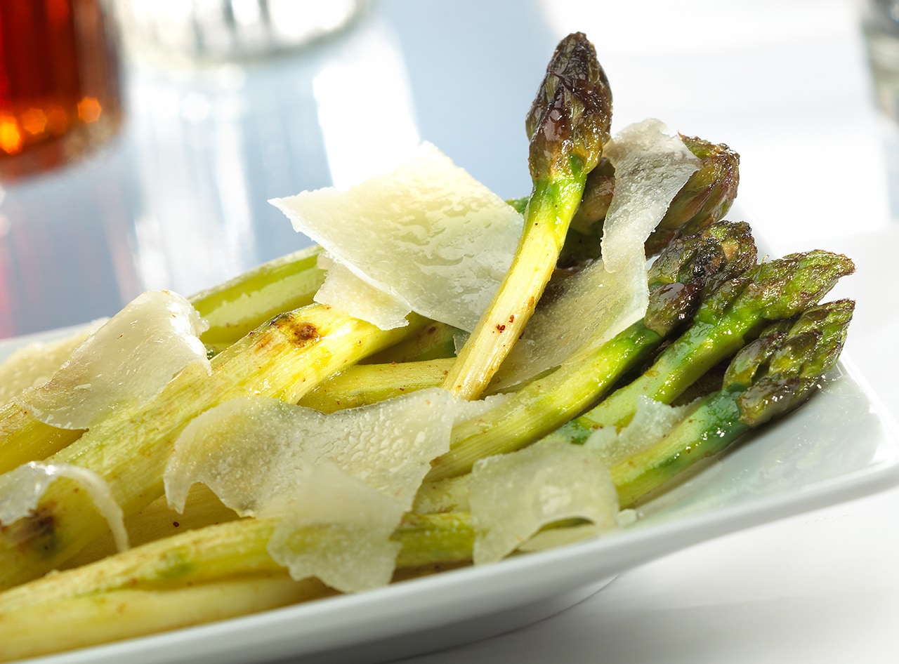 9. En el momento de sacar los espárragos del fuego, los espolvorear con el queso, delicadamente, puesto que no debe de quedar una papilla, justo un hilo de queso encima de cada espárrago.