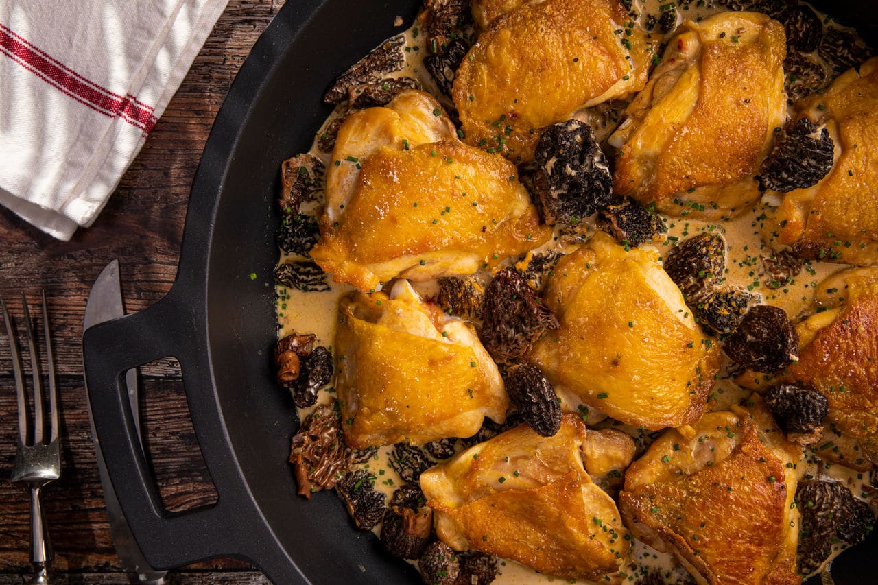 - Cuando vayas a cocinar, calienta una cocotte o una olla baja y ancha con tapa. En cuanto esté bien caliente, añade un hilo de aceite de oliva y coloca los contramuslos con la piel hacia abajo.