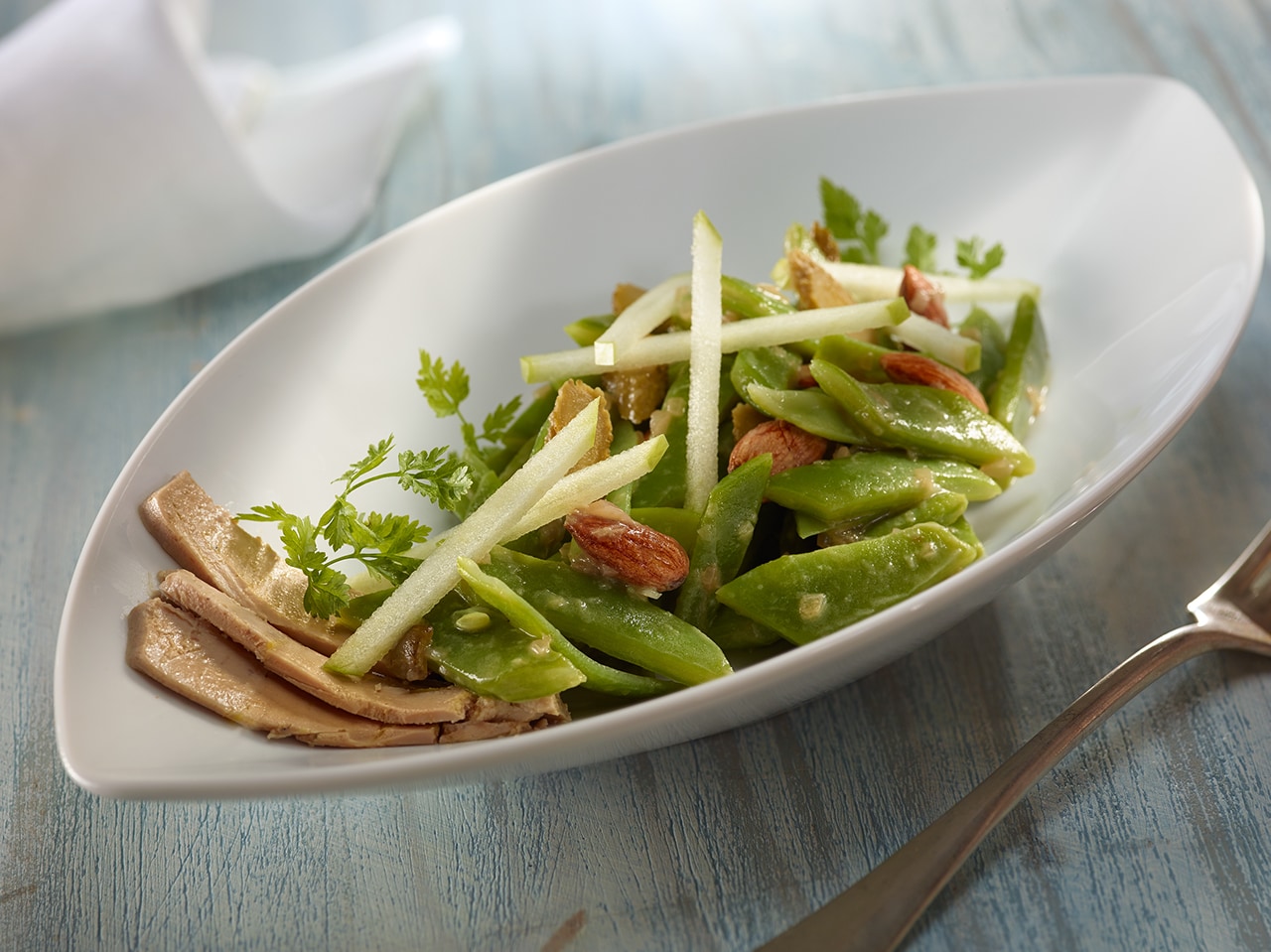 Agregar la vinagreta caliente, el perejil picado groseramente y unos tacos de foie gras recién cortado.