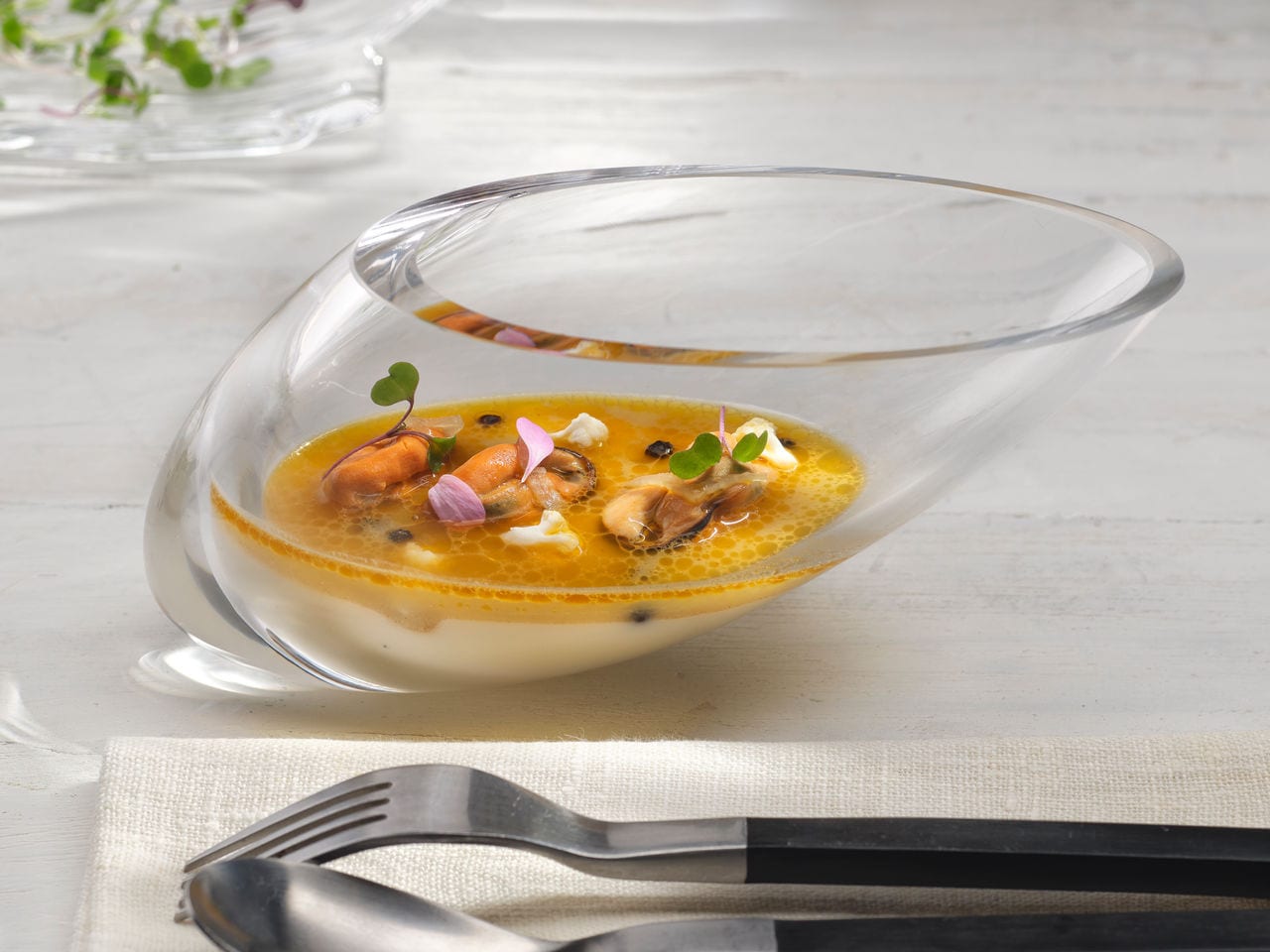 Cocer en agua sin sal a borbotón fuerte, las coliflores en ramilletes, hasta que queden muy hechas, escurriéndolas perfectamente. Entonces, meterlas en un vaso americano con las soperas de jugo de mejillón, accionando la máxima potencia y añadiendo en hilo el AOVE. Rectificar el sazonamiento, si fuera necesario.