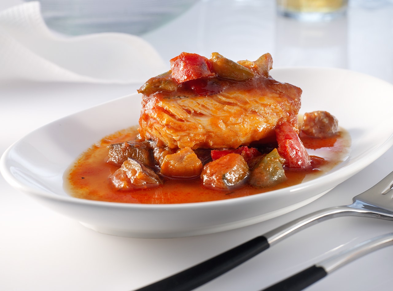 11. Bajamos la intensidad del fuego del pisto al mínimo y en cuanto el hervor sea imperceptible, deslizamos los lomos de pescado en la salsa, cubriéndolos perfectamente y dejando que se cocinen allá durante unos 10 minutos, dependiendo del grosor del pescado.