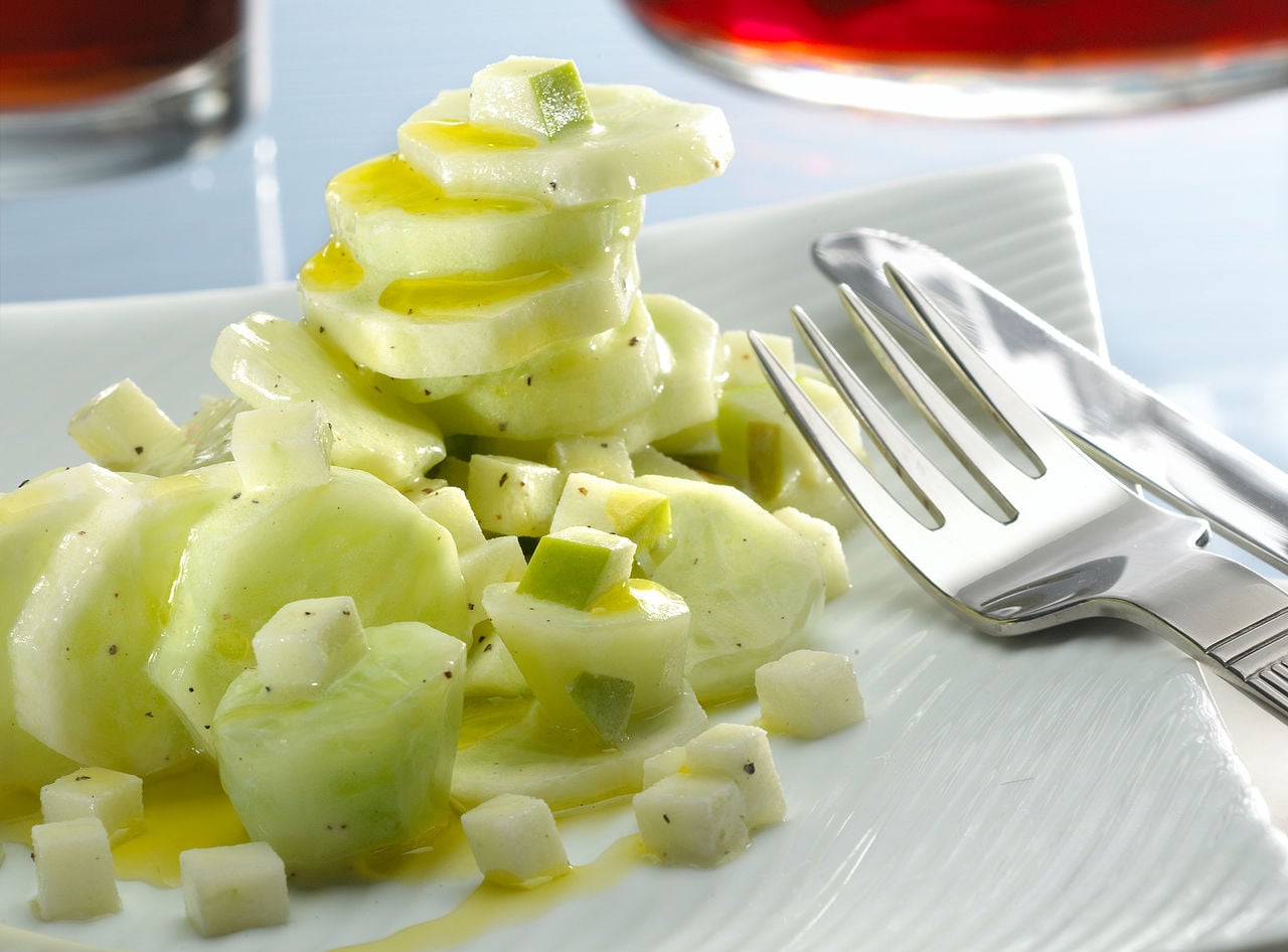 Los pelamos y les retiramos todo rastro de piel que pudiera quedar. Cuanto más lleguemos al centro del fruto, más jugosos y más gelatinosos. Es muy útil ayudarse de un pelador de patatas bien afilado, para pelarlos correctamente. Con ayuda de un cuchillo bien afilado, los partimos en rodajas bien delgadas que pondremos delicadamente en un bol. Lavamos bien las manzanas. Las partimos en dos y les retiramos con mucho cuidado el corazón, el tallo y las pepitas, dejando la piel. Entonces las partimos también con ayuda de un cuchillo bien afilado y sobre una tabla, en cubos pequeños, como del tamaño de un dado del parchís. Conforme las vamos troceando, las añadimos al bol en el que está el pepino. Lo rociamos con el zumo de limón.