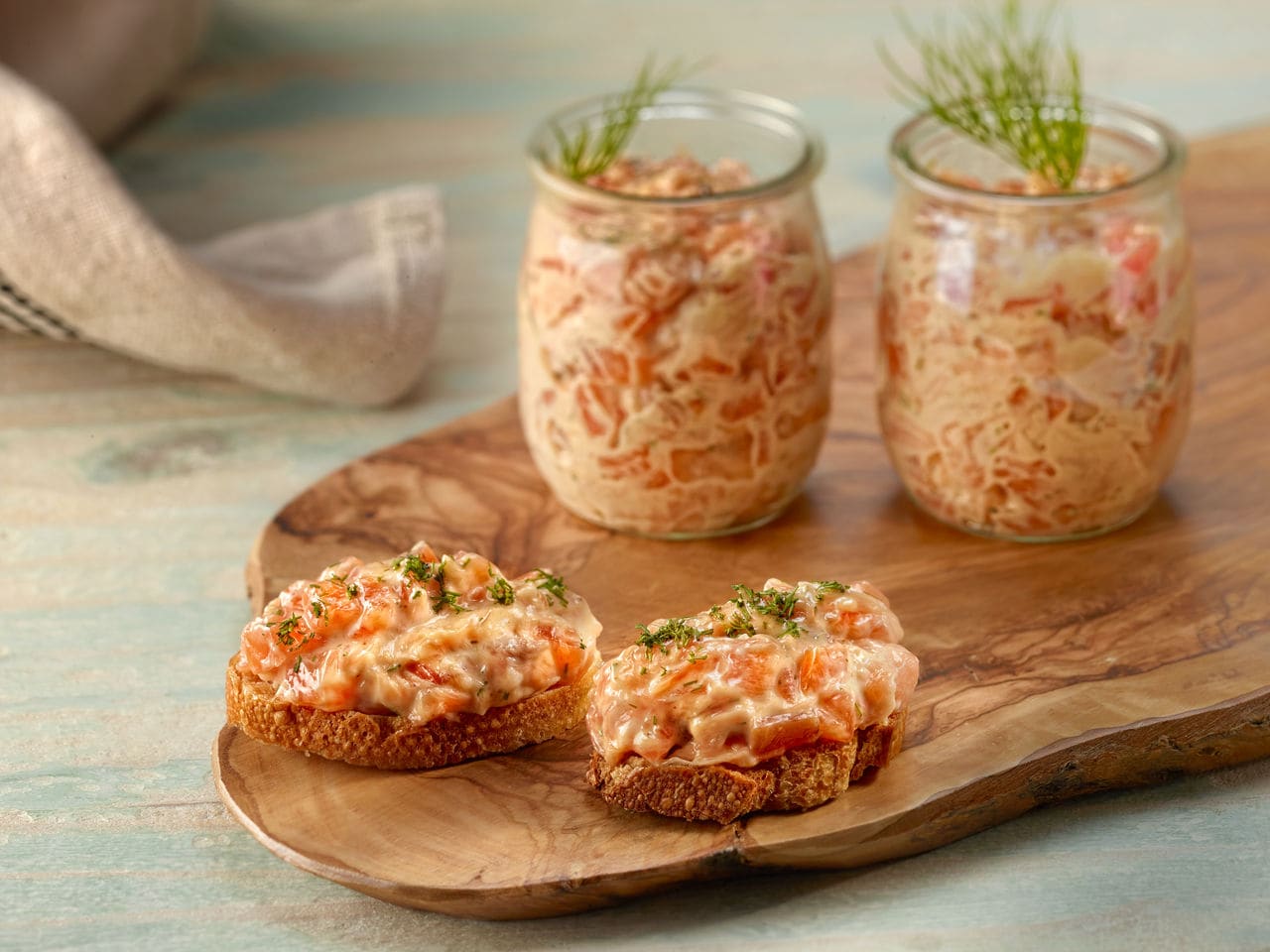 Colocar la mahonesa de curry en un bol, agregar el salmón ahumado, el salmón cocido y el eneldo picado, mezclar delicadamente.