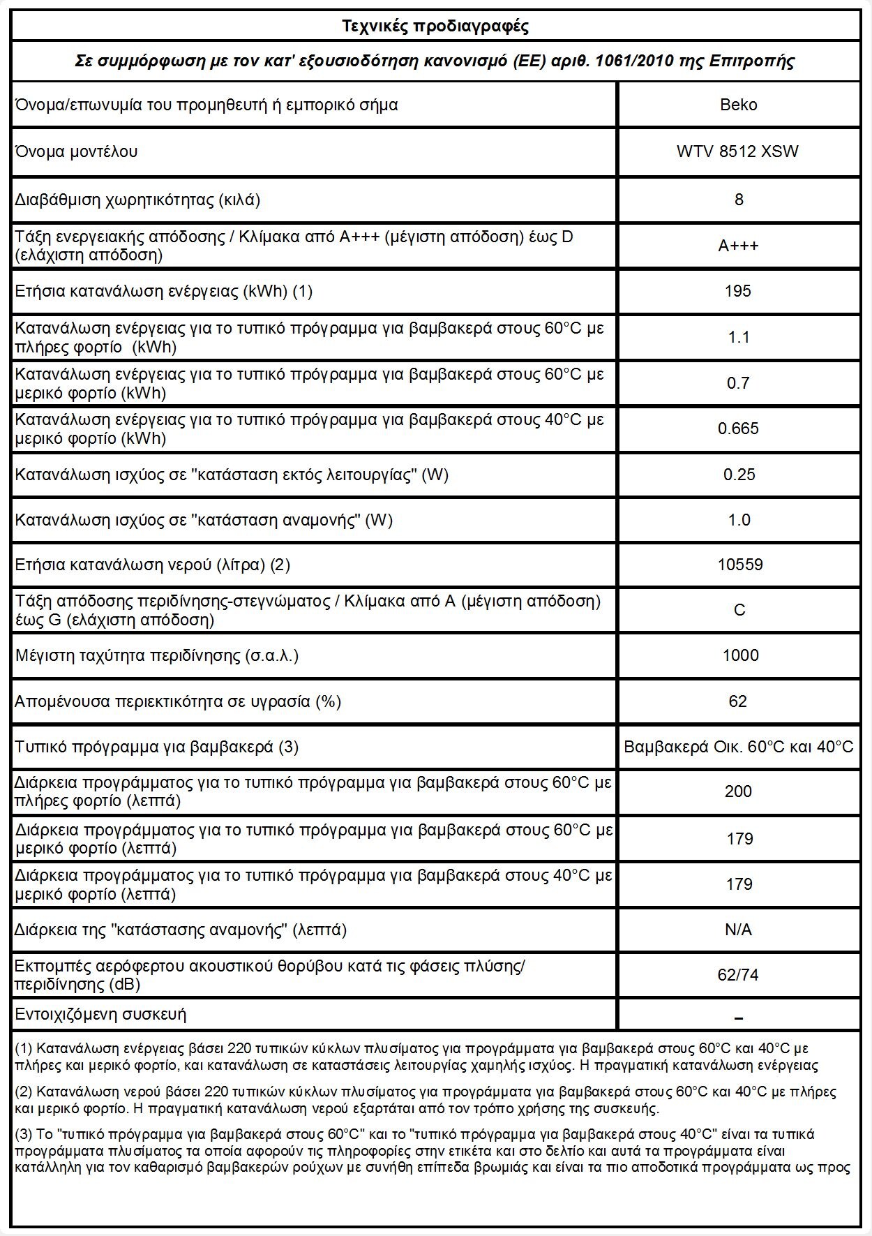 • Επίπεδο θορύβου πλύσης 62 dBA