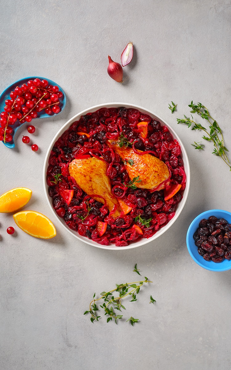 ضعي جلد الدجاج باتجاه الأعلى عند الشواء. قومي بترتيب البصل والبرتقال المتبقي والقشر، والثوم، والتوت حول وبين قطع الدجاج.