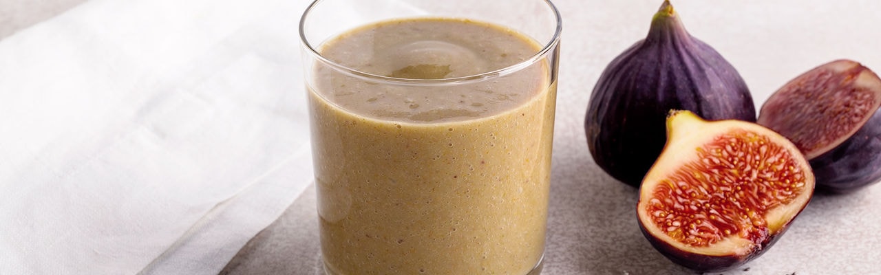 سموثي التين اللذيذ معد من التين الطازج وحليب جوز الهند إضافة إلى بذور الشيا والموز.