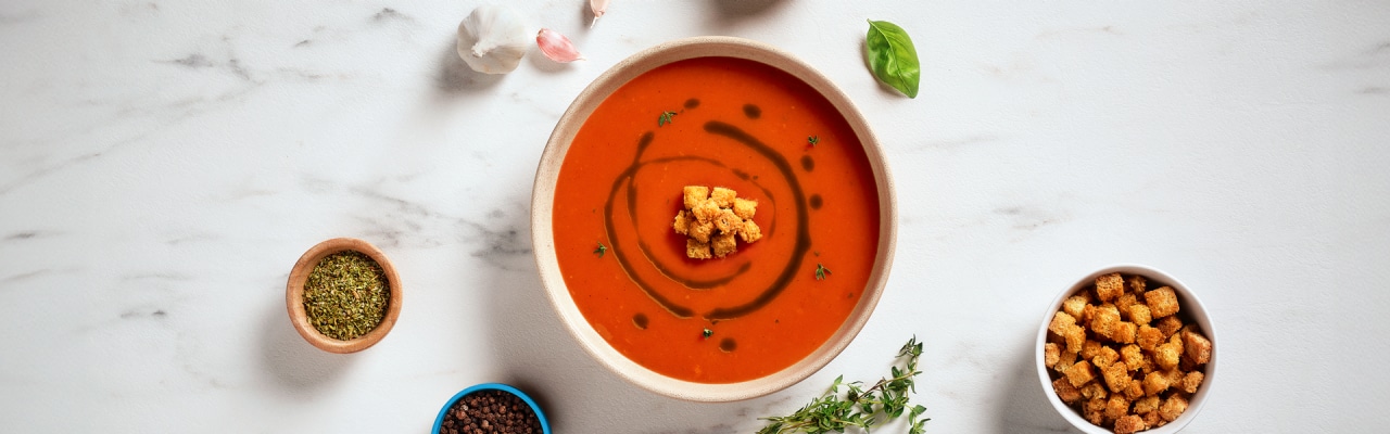 - After roasting, let the tomatoes and garlic cool for 10 minutes. Transfer them to a pot and blend using the Beko Starlight Hand Blender until smooth. Add basil and roasted onions, blend again.