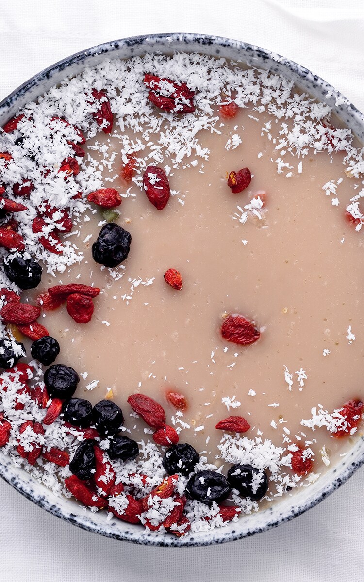 5. Serve with drizzle honey, sprinkle goji berries, blueberries and coconut. Enjoy!