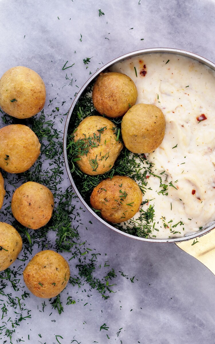 3. Pour sour cream on bottom the plate and place falafels on top. Serve with chopped dill.