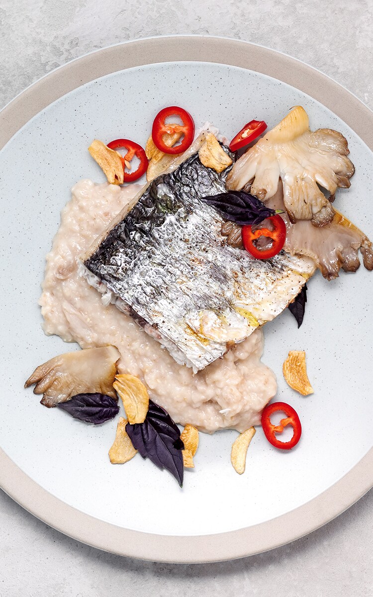 8. Take the porridge on serving bowls place sea bass fillets on top. Place garlic crisps
