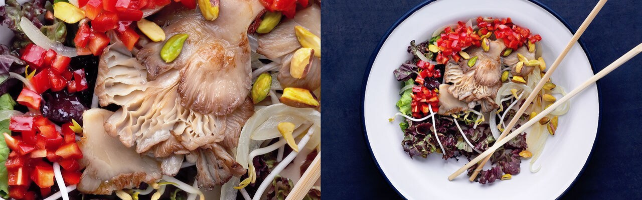 mushrooms mixed on top of lettuce irregularly. Sprinkle pistachio and red pepper,