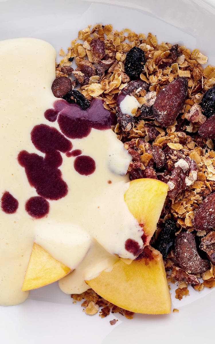 5. Place peach yoghurt puree bottom of plate, drizzle acai pure on top. Place granola on