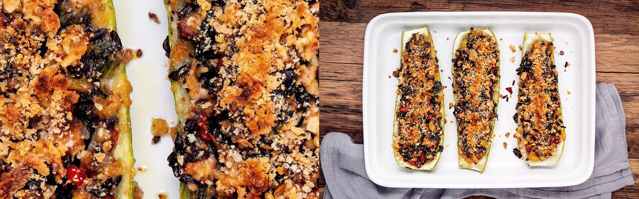 Simply stuff the zucchini boats with the turkey stuffing, bake, and enjoy!