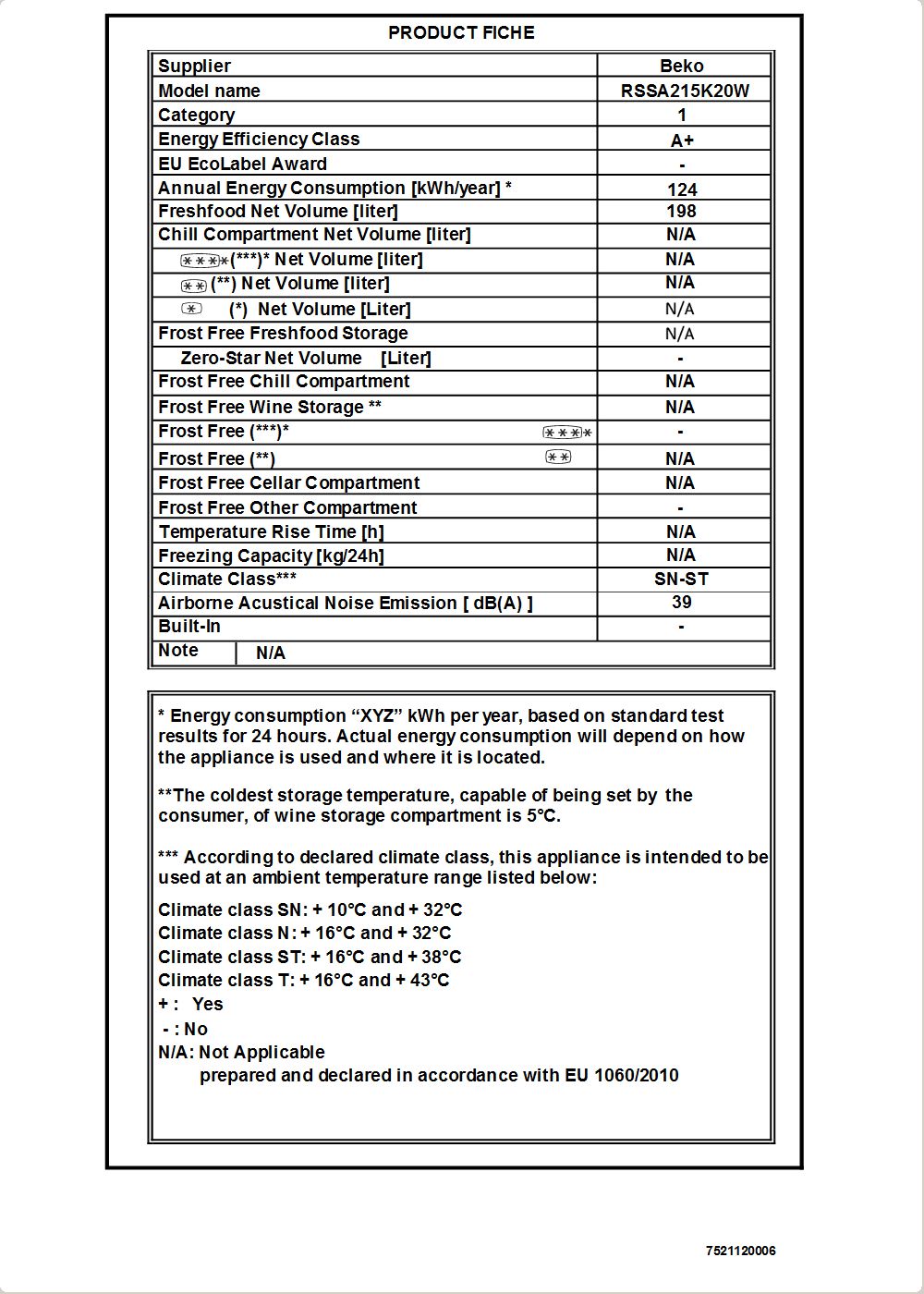 RSSA215K20W: Hűtő (Egyajtós, 198 l)