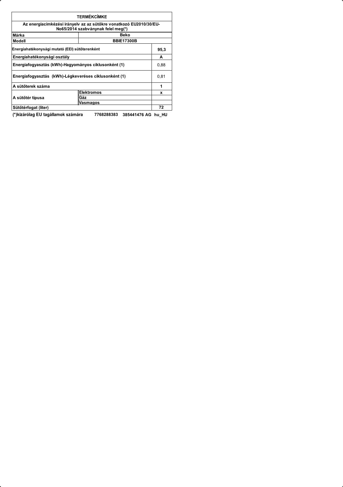 BBIE17300B: Beépíthető sütő (60 cm 72 l)