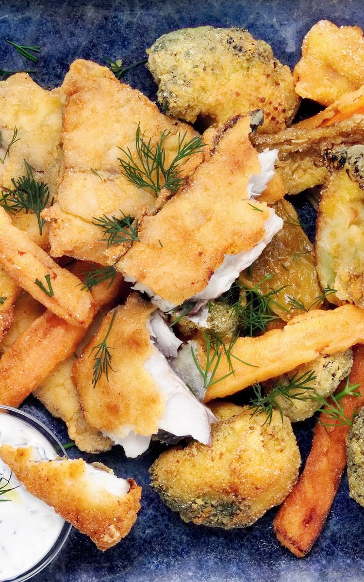 يتكون هذا الطبق من شرائح السمك المتبلة والمغطاة بخليط دقيق الذرة المقرمش و المطهوة في الفرن مع