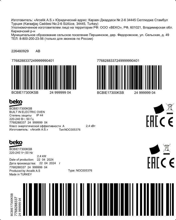 BCBIE17300KSB: Forno Beyond DeepBlack, b300, 6 Funzioni